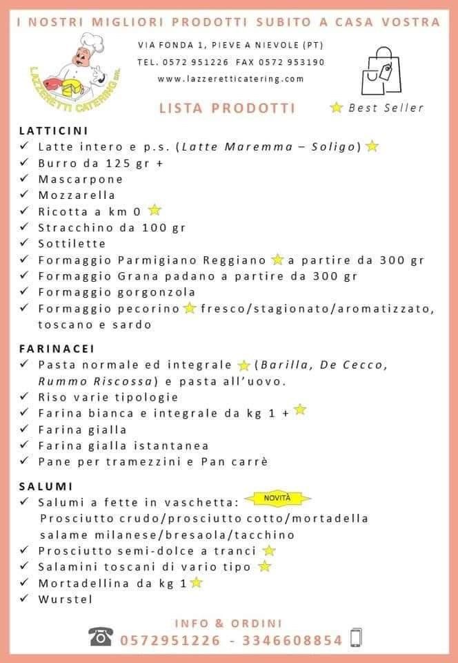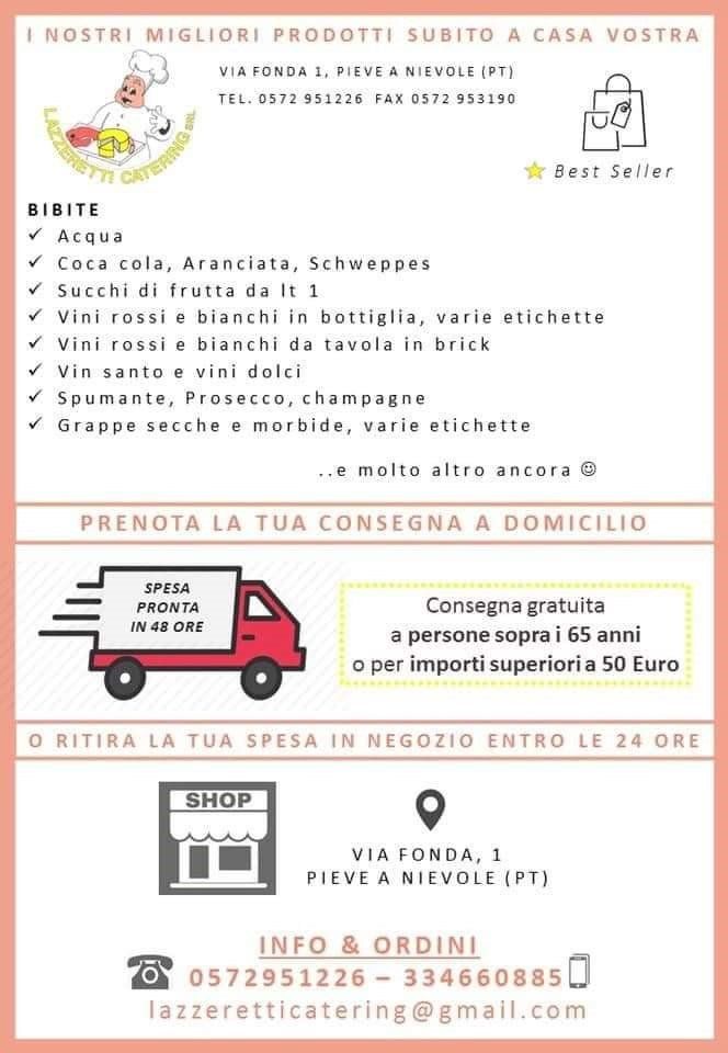 L’azienda Lazzeretti Catering srl, situata a Pieve a Nievole, in provincia di Pistoia, è un negozio di alimentari che si dedica, sin dagli anni Novanta, alla vendita all'ingrosso dei suoi prodotti, come: salumi, formaggi, prodotti dolciari, pasta, riso, mozzarelle, pomodoro ed alimenti conservati, con possibilità di prenotare in anticipo gli articoli e riceverli comodamente presso il magazzino del tuo ristorante, bar o pasticceria. Questo è  reso possibile attraverso  il vantaggioso e funzionale servizio di consegna a domicilio,  soluzione sempre rapida e puntuale: i nostri clienti ne sono entusiasti, poiché permette loro di risparmiare tempo da spendere in altro modo e aspettare tranquillamente i loro ordini nella propria sede di lavoro o dove preferiscono, senza preoccuparsi di doversi recare in negozio e dover trasportare pesanti ed ingombranti merci. La consegna a domicilio o presso la sede dei nostri clienti viene effettuata in tutta la Toscana e in Lombardia, nella zona di Milano in particolare, dove Lazzeretti Catering è presente tutte le settimane per le consegne. E' possibile anche, su richiesta, consegnare anche all'estero: Romania, Bulgaria, Germania, Svizzera e Spagna.